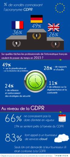 Concrètement, plus de la moitié des personnes interrogées (56 %) n’ont pas pu identifier la signification du terme »GDPR ». De plus, 52 % d’entre elles ont admis qu’elles n’étaient pas préparées. Par ailleurs, plus d’un tiers (35 %) des sondés ignorent si les stratégies et processus informatiques mis en place au sein de leurs entreprises sont conformes à la nouvelle réglementation. À l’inverse, 13 % des personnes interrogées placent le GDPR dans leur liste des priorités et 12% seulement seraient prêtes au changement. L’enjeu est pourtant de taille alors que le GDPR prévoit de fortes amendes (jusqu’à 100 millions d’euros ou 5 % du chiffre d’affaires mondial) pour les organisations qui enfreindront les règles ! La France en milieu de podium Les résultats de cette enquête doivent pourtant être utilisés avec précaution. En effet, Ipswitch passe sous silence bon nombre d’informations. Par exemple, la nature exacte des métiers exercés par les sondés n’a pas été précisée. Rappelons-le, la problématique des données personnelles touche en priorité les Directeurs et les Responsables de la sécurité des systèmes d’information (DSI et RSSI) des entreprises. Mais également les Centres de supervision urbains (CSU) qui opèrent les caméras de vidéosurveillance déployées en ville. Citons encore les entreprises qui sécurisent des accès physiques avec, par exemple, des équipements biométriques. Ainsi que toute organisation qui doit gérer de près ou de loin des informations d’identification (voir encadré : »Qu’est-ce-qu’une donnée personnelle? »). Avec l’explosion de l’informatique dans le nuage (Cloud Computing), nul doute que cette liste non exhaustive se rallongera de manière exponentielle dans les années à venir.