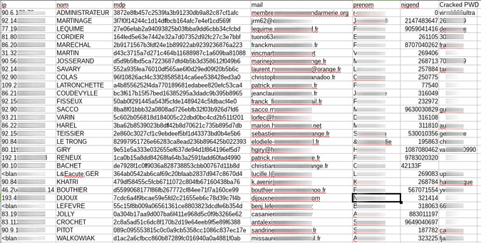 Outre d’habituelles attaques DDOS qui ont provoqué l’indisponibilité d’une vingtaine de sites internet, dont celui du syndicat de policiers Alliance http://anorgend.org, le collectif a surtout piraté le forum d’un site internet dédié aux réservistes de la Gendarmerie http://www.reserve-gendarmerie.org, destiné à « faire connaître la réserve et à mettre en relation les réservistes et candidats ». Ils affirment avoir réussi à pirater les noms, adresse e-mail, adresse IP et mot de passe (pour certains déchiffrés) de quelques 2 000 membres inscrits sur ce forum, et fournissent une capture d’écran de la base de données en guise de preuve :